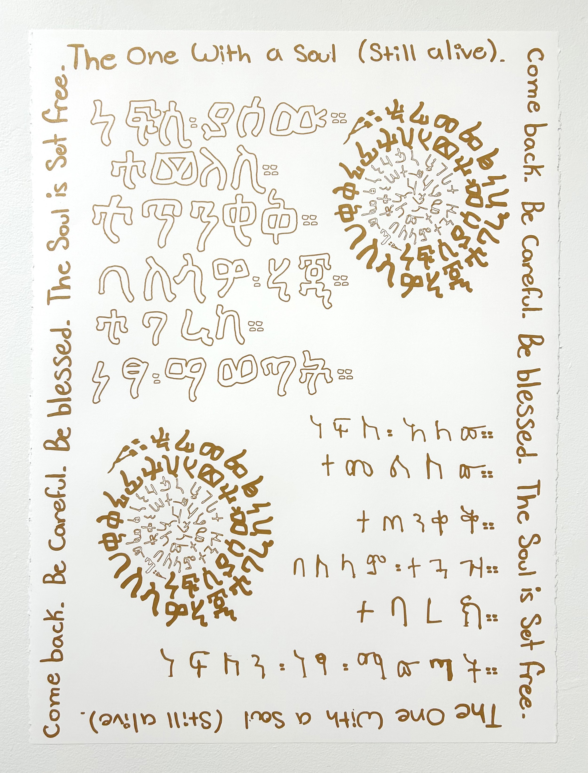"The Amharic characters hand-printed on the textiles are a series of poetic prayers that I wrote after reading accounts of the violence against Black women migrating to Europe from Africa and thinking about the fragility of Black lives here in the U.S. Early anti-African and anti-Black colonial structures, as well as the practice in Islamic contexts of thirteen centuries of trafficking and enslaving African women, continue to have political and economic reverberations that shape modern policy. One way I address this continuity is through process and art; another is through the use in my practice of my ancestral tongue. It allows me, as a first-generation Ethiopian American, to literally and metaphorically communicate with my hybrid kinship. This is my attempt to gather elements of language, memory, and ritual into my practice. Since I do not read or write Amharic and speak it loosely with a heavy American accent, my interpretation of the language and these protective sayings are intentionally not translated correctly. In doing so, I am exploring what gets lost in translation when culture migrates to a new world. The prayer in The Soul Is Set Free :: ነፍስን ነፃ ማውጣት reads as follows: